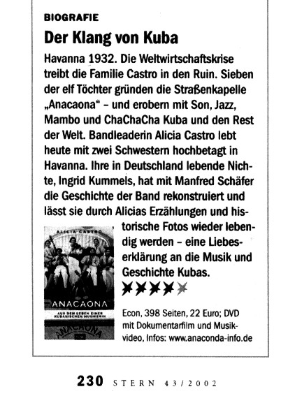 Heute, mit über achtzig Jahren, blickt Alicia Castro zurück auf die aufregendste Zeit ihres Lebens. Sie erzählt vom Hin und Her zwischen einfachem Leben und Luxus, zwischen Erfolgen und Tiefschlägen, von der Familie, den Beziehungen der Schwestern untereinander, von Verehrern, von Liebe, eifersüchtigen Ehemännern und dem kubanischen Alltag. Entstanden ist diese einzigartige Lebenserinnerung in unzähligen Gesprächen mit Alicias Nichte Ingrid Kummels, die Tochter von Schlagzeugerin Millo, und Manfred Schäfer. Alicia Castro wurde 1920 in Havanna, Kuba, geboren. Bereits mit zwölf Jahren spielte sie im Orchester ”Anacaona”.